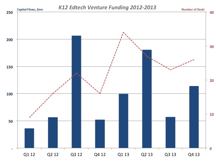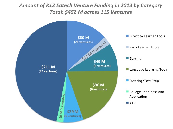 - Language learning tools, with its large market opportunity, continue to attract later stage venture capital – $90 million in 2013. OpenEnglish and Voxy closed significant rounds of financing.