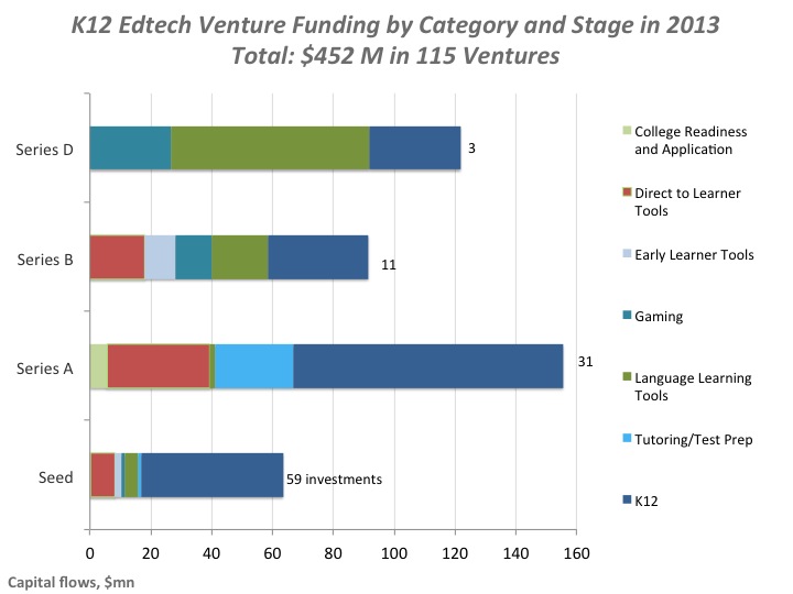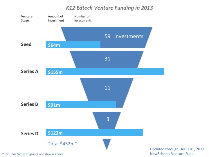 Venture investment in K12 education technology was up 6% in 2013, totaling $452 million. Over half of these investments were seed stage transactions mirroring the overall venture trend of increased financing from non-traditional sources (angels, super angels, micro-VC’s, incubators) at the seed stage.