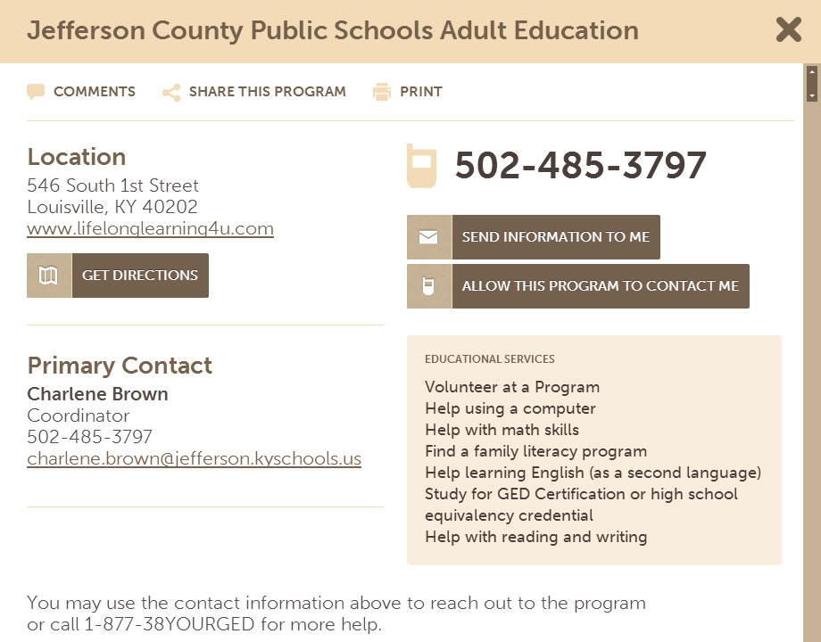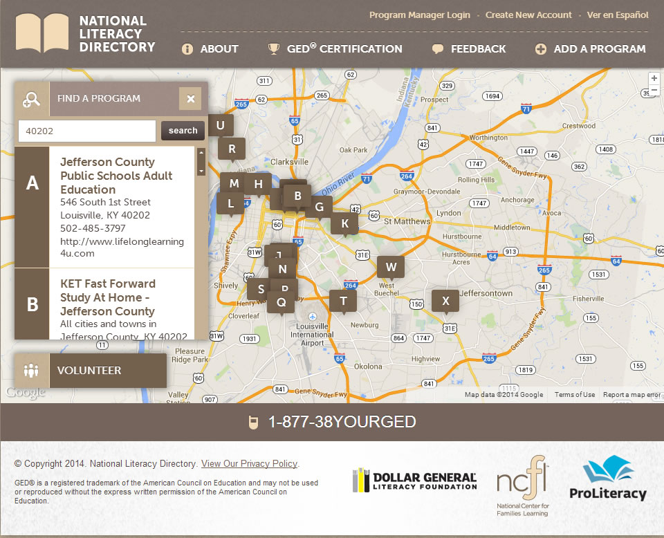 From the main page of the site, entering a zip code into the search field populates a list of nearby organizations offering programs for adult education, returning learners, or those interested in taking the necessary steps to earn a GED. For example, a zip-code search for programs in the greater Louisville, Kentucky area immediately returns twenty-four educational agencies or GED-testing sites nearby.