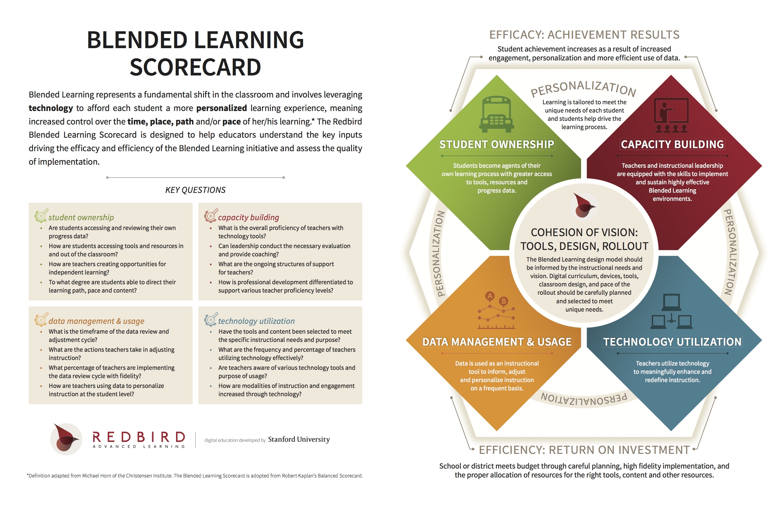 The Blended Learning Scorecard (seen above) is designed to help educators understand the key inputs driving the efficacy and efficiency of the Blended Learning initiative. How?