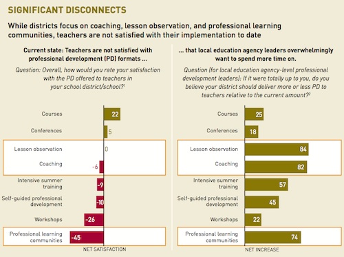 Conducted by the Boston Consulting Group with support from the Gates Foundation, the report surveyed over 2,900 teachers, administrators and professional development leaders. Among the findings: teachers rank courses and conferences as the PD formats they are currently most satisfied with. Lowest on their list are professional learning communities and workshops.