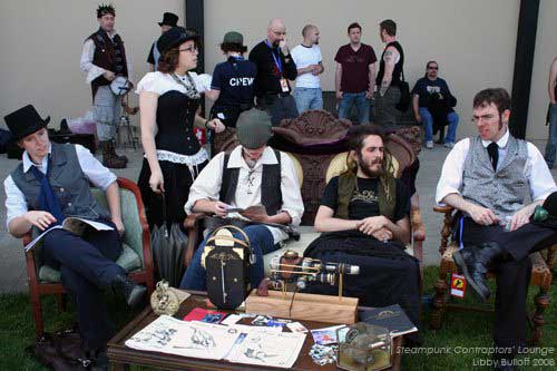 In 2008, Maker Faire reached out to many of the movers and shakers in the steampunk community and invited them to create their own mini happening within the Faire. Together Make: editors and the steampunks created The Contraptor’s Lounge. Icons of the movement such as the late Datamancer, Jake von Slatt (Steampunk Workshop), Libby Bulloff and Margaret Killjoy (Steampunk Magazine), the steampunk rock band, Abney Park, and many others showed up. For many, it was the first time they were meeting face-to-face and the event proved to be an important one in the history of the steampunk scene. Volume 17 of Make:, the “Lost Knowledge” issue, was an outgrowth of this event within the event. Steampunks have been an official part of Maker Faire ever since. [Top two photos by Libby Bulloff, bottom illustration, of Jake von Slatt and Datamancer, by Suzanne Forbes]