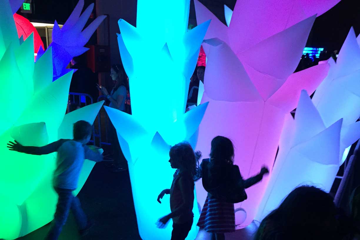 In the "Dark Room" hall of the Maker Faire, after my eyes adjusted to the darkness, I was immediately drawn to the surreal Illuminated Forest. In the Illuminated Forest are inflated asparagus tip-shaped "trees" that glow from the inside. This area was cordoned off by a wall of tables and tape with a person who was trying to act as a traffic manager, controlling the flow of people in and out of the forest. This role was important because, if my child was any indication, kids were having a blast in there and did not want to leave. It was a perfect place to play hide-and-seek and tag. My daughter and her friend quickly disappeared once we went into the forest and they allowed me only momentary glimpses as they taunted me from behind the glowing trees. I'm not quite sure how we escaped without knocking heads with other kids who were engaged in the same shenanigans, but we eventually exited unscathed to explore other glow-in-the-dark experiences.