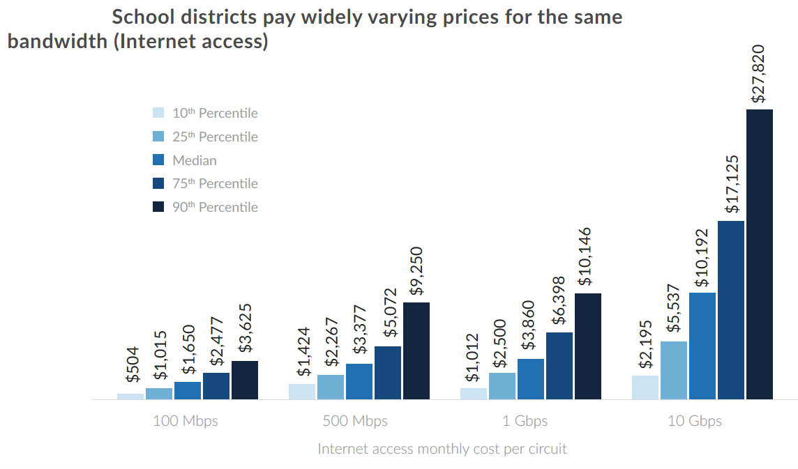 Doing market research—especially where there are multiple Internet service providers—is essential to getting better rates, Marwell recommends. The report finds major variance in how much districts are paying for the same level for service. The monthly cost for a 100 Mbps connection can range from ranges from $504 to $3,625; for 10 Gbps service, the difference can be more than twelve-folds.