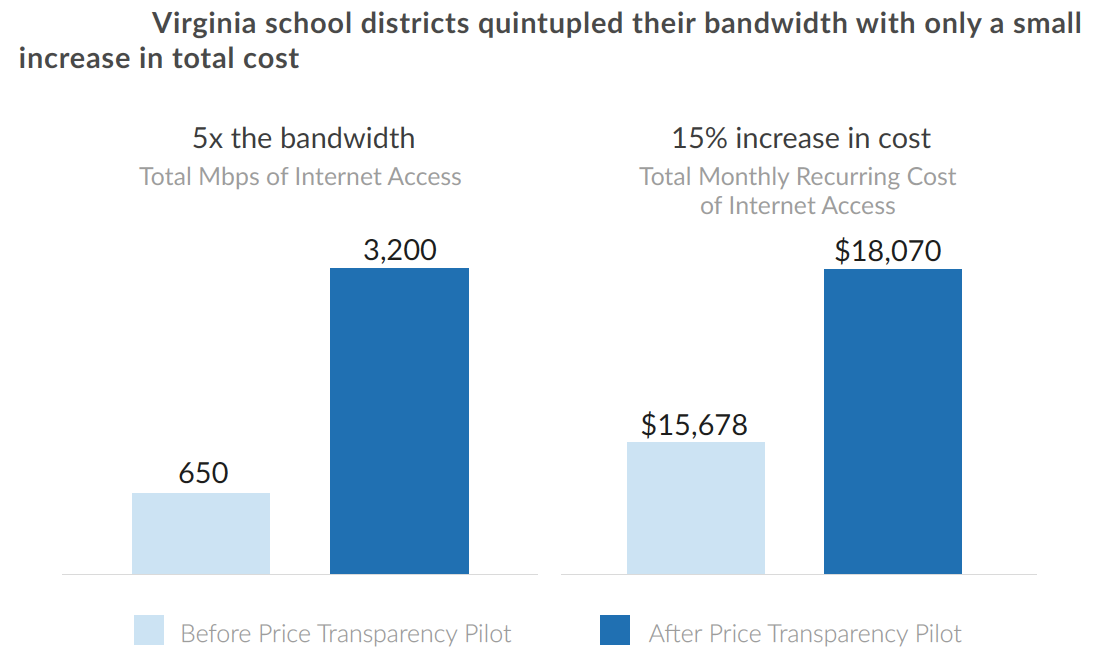 He points to Virginia as one example where group purchasing led to lower prices. There, five districts realized that they were paying much more than they should and organized a consortium to renegotiate rates. As a result, they were able to quintuple their bandwidth for only a 15 percent increase in costs.