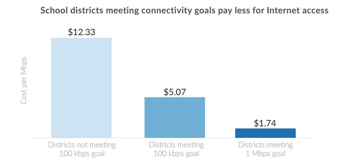 What’s holding schools back? An estimated 9,500 of them still lack fiber, “the only commercially available technology that is scalable enough to support the projected bandwidth needs for the vast majority of school districts,” according to the report. These efforts require investments: districts that currently provide 100 Mbps of connectivity per student invest nearly $5 per student per year from their budgets—more than twice as much as districts that do not meet the target.