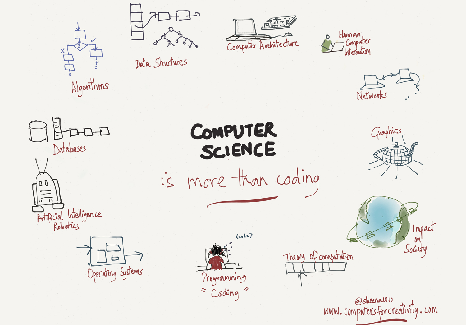 This doodle shows some of these parts of computer science; coding is just one of them.