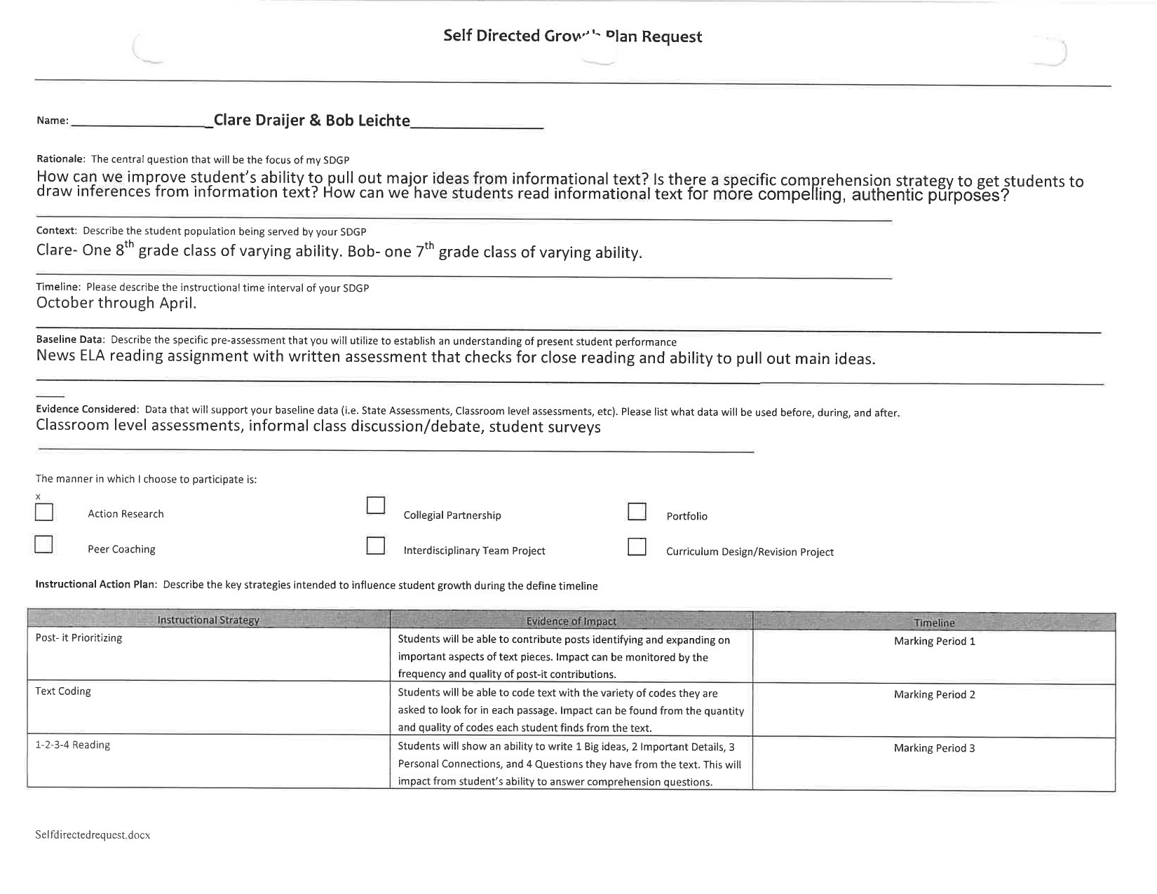 Rather than participating in the traditional observation model, self-directed growth plans allow experienced teachers to be evaluated alternatively. Teachers create clear, measurable objectives based on current needs and data in their classrooms. Plans on how to achieve the desired objectives are created (with the required Student Growth Objectives embedded) and take the shape of action research, peer coaching, collegial partnerships, interdisciplinary team projects, portfolios, curriculum design/revision, or other mutually agreed-upon models. (See example below.)