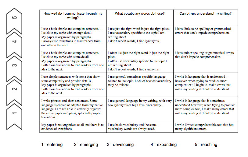 A good practice is to create rubrics in the beginning of the year with students to help them better understand class expectations for assignments. For example, a rubric can be started on a shared Google Document in which the teacher provides the categories, and students collaborate to complete the rows. Rubrics for ELL’s should be written in language that is easy for students from various backgrounds to understand. (Click here to see a sample ESL level 2 student produced rubric.)