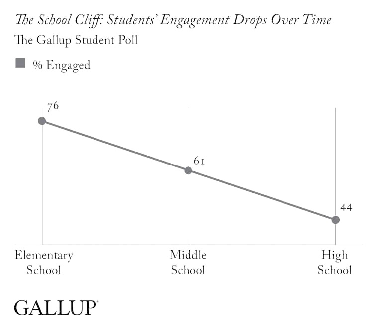 The problem with the current public education model is that it was created for the industrial revolution. In fact, U.S. Secretary of Education Arne Duncan said that the K-12 system “largely still adheres to the century-old, industrial-age factory model of education.” Essentially, students come to school at the elementary level excited about learning—but become disengaged by the time they get to high school, as evidenced by the graph to the right.