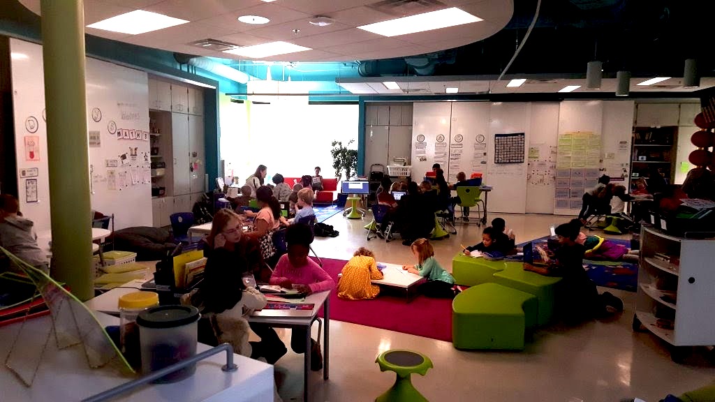 From Curriculum to Projects: Across Agnor Hurt, students often work in groups on a variety of tasks. For the students in this space, here’s what an average Tuesday morning looks like: In one corner of the room, 4th and 5th graders practice writing and storytelling by taking screenshots in Minecraft and assembling them in Google Slide presentations. A few feet away, a large group of Kindergartners receive direct literacy instruction from a teacher, surrounded by movable bookcases.