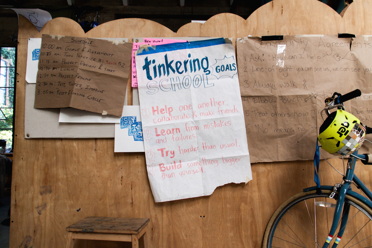 Housed in a converted warehouse, Brightworks' pedagogy consists almost entirely of project-based learning. Students learn in "arcs" of investigation into a single topic, and the largest piece of each arc is a project that articulates and challenges the students' understanding of various concepts. Think of a Montessori school with power tools.