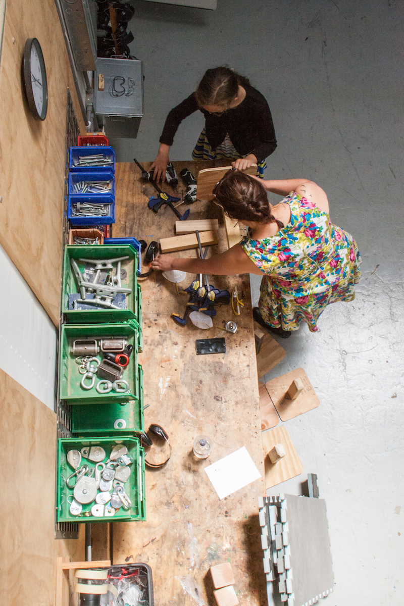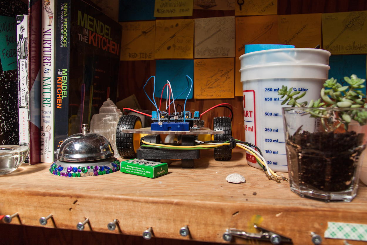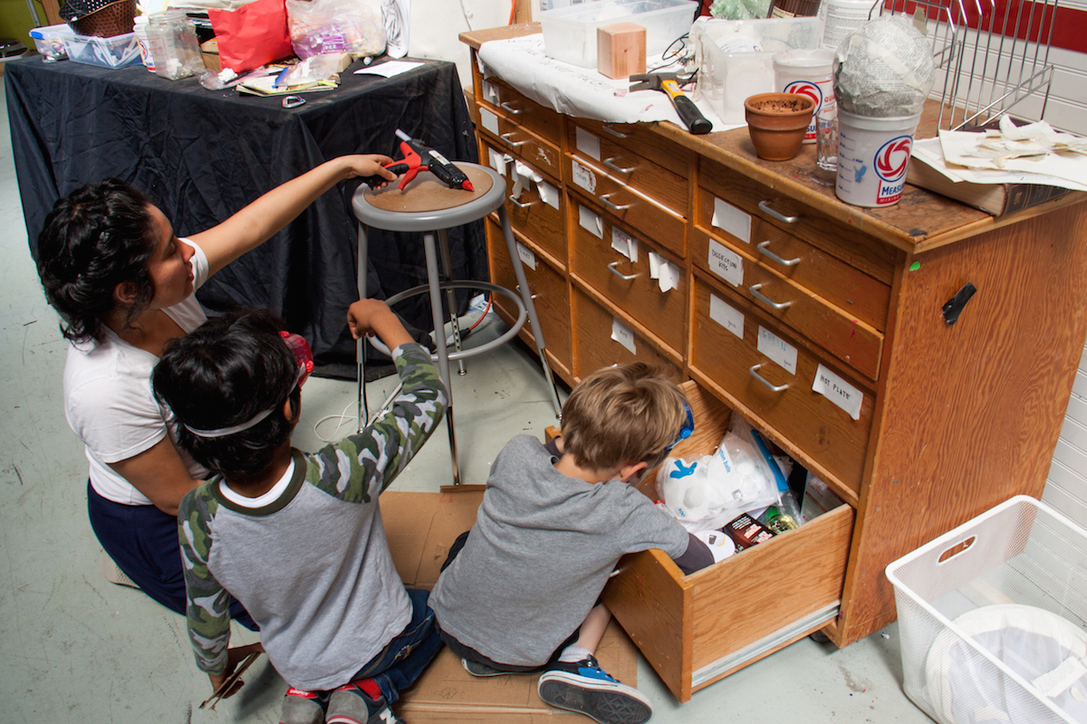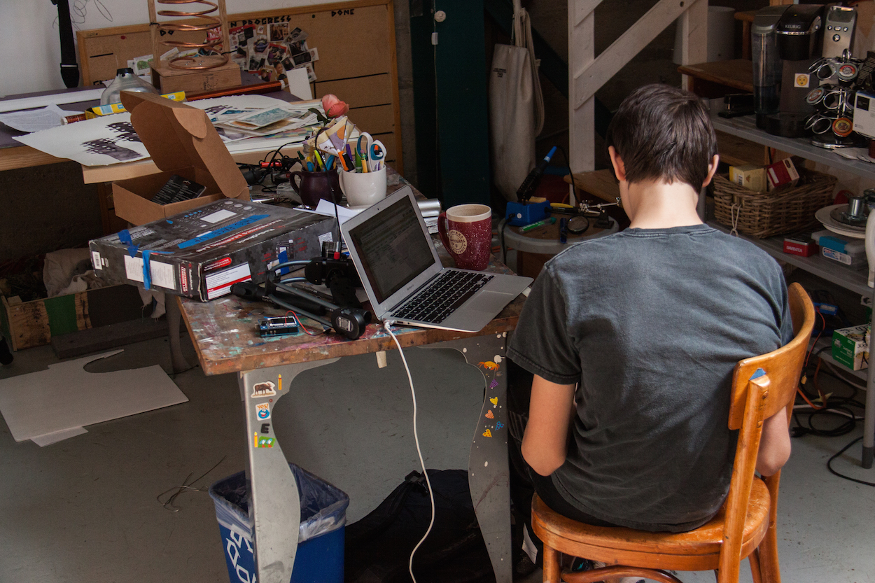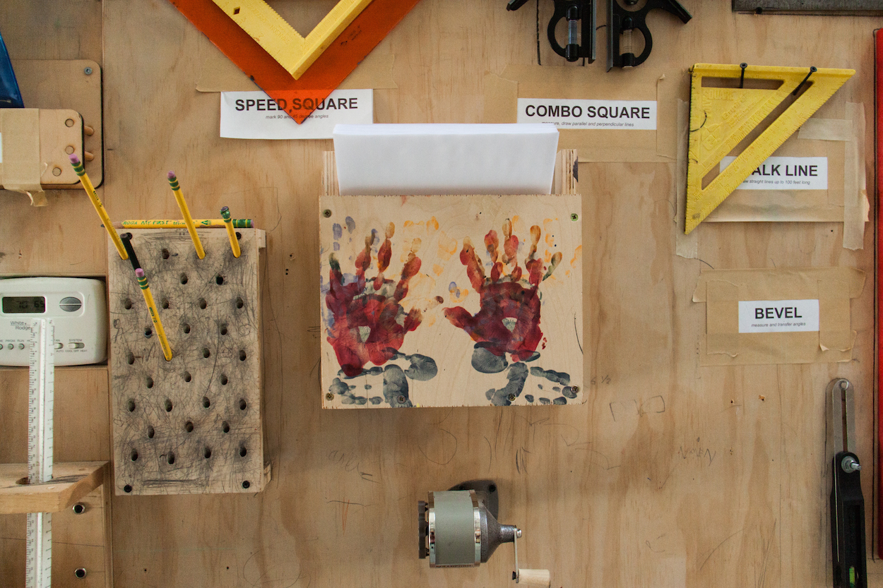 Everything is everywhere—multiple walls of tools, drawers full of craft supplies, just-potted plants, circuit boards, foam core pieces, piles of paper, toys, laptops, books—but everyone seems to know where each necessary piece of a projects is.