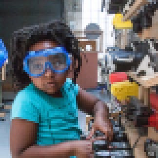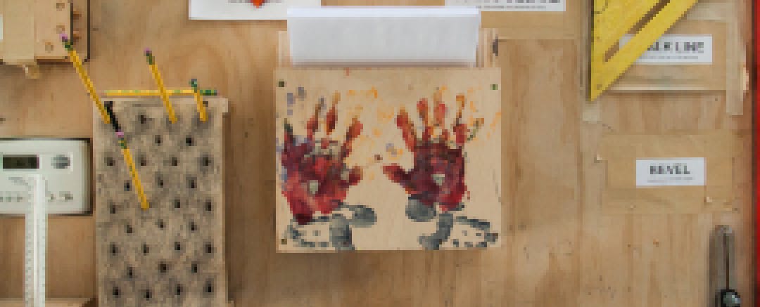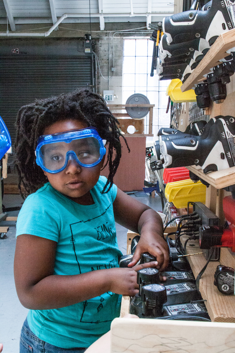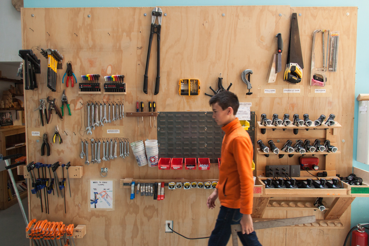 Throughout Brightworks, the childish mixes with the industrial: picture books and power drills, finger paint and circuit boards, foam core and Legos. Several younger students were wearing both animal sweatshirts and lab goggles as they used power saws to cut wood.