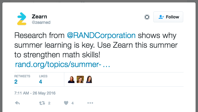 Mote also describes her frustration with companies that call out research studies as a marketing tactic, such as mentioning both studies and the product within a brief, 140-character Tweet or Facebook post—even though the study is not about the product itself, as in the Zearn Tweet below. “I think there is danger in linking studies to products which don't even talk about the efficacy of that product,” Mote says, calling out that companies that do this effectively co-opt research that is unrelated to their products.