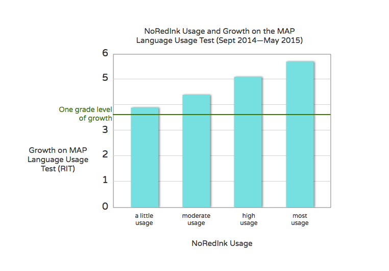 Here’s another example: In a third-party study released by writing and grammar platform NoRedInk involving students at Shadow Ridge Middle School in Thornton, CO, the company claims that every student who used NoRedInk grew at least 3.9 language RIT (student growth) points on the popularly-used MAP exam or—by equivalence—at least one grade level, demonstrated in a graph (shown below) on the company’s website. But upon further investigation, there are a few issues with the bar graph, says Alpha administrator Jin-Soo Huh.