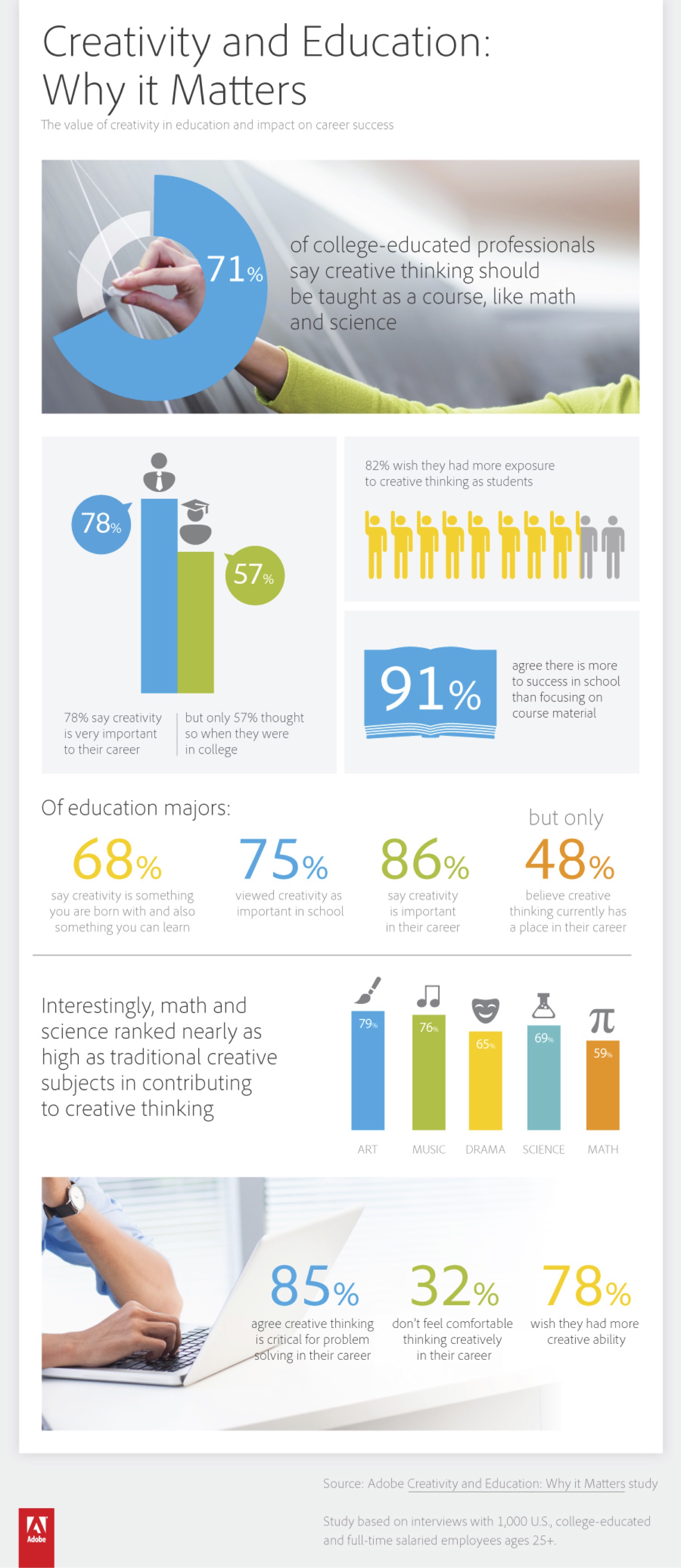 According to a study from Adobe (which an accompanying infographic shown to the right), 82% of college-educated professionals wish they had more exposure to creative thinking as students. As teachers, if we use technology solely for its own sake, we do students a disservice. Technology can allow students to show off their creativity. Conversely, students can show their creativity even without using technology. How wonderful it would be to connect students’ creativity, talents, and interests to content knowledge!