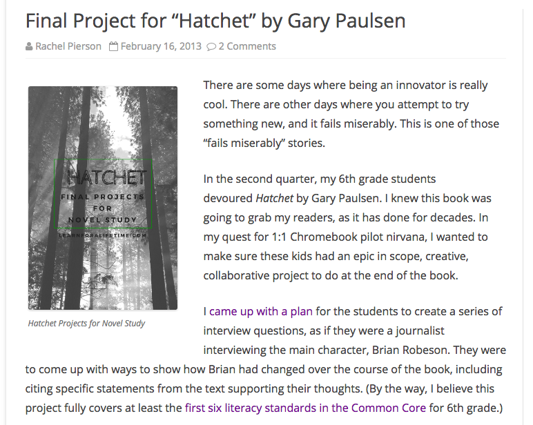 Example project: For a final project after reading Hatchet (shown above), students were able to use an audio-recording platform to explain how the main character changed over time (RL.6.3).