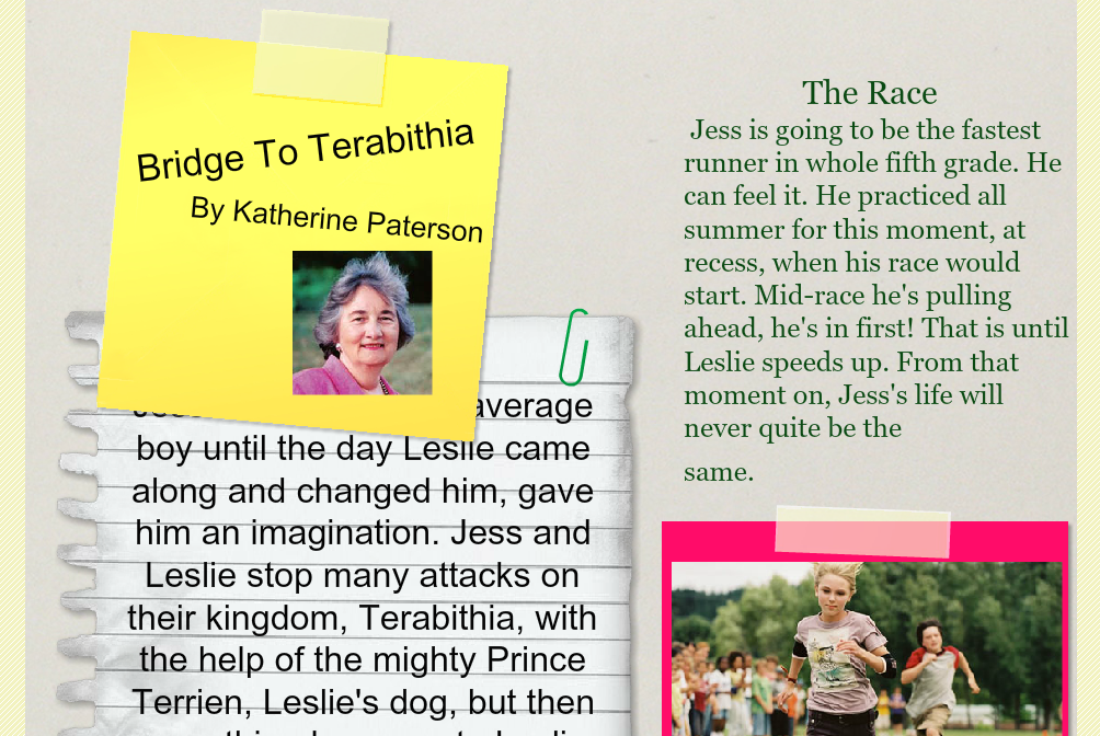 Example project: A poster project could be done digitally, such as this example, created by a 6th grade student for the novel Bridge to Terabithia (meeting standard RL.6.3).