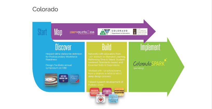 From July 2013 through the present, 2Revolutions has worked with the Colorado Department of Education (CDE) and the Colorado Education Initiative (CEI) to help the state move towards a next generation learning model focused on student-centered learning across its districts.The company supported CDE and CEI to explore possible strategies for beginning this transformation and continued to provide assistance as districts and schools started experimenting with changes and eventually engaged in whole school redesigns. It also worked at the district level to ensure that the conditions necessary for the changes were in place.