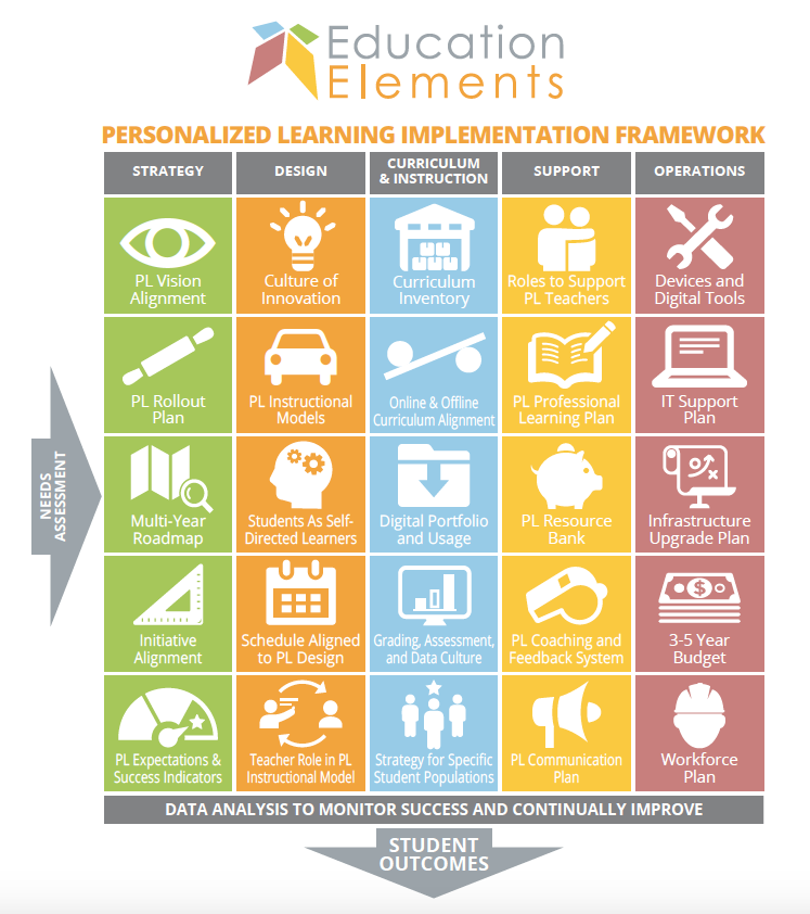Education Elements created a personalized learning implementation framework, which is a central document used throughout school redesign. The framework is a five-by-five square grid that includes many different elements that the company considers when building a personalized learning environment.
