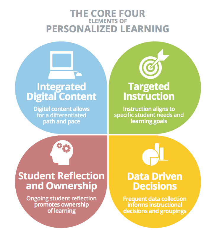 Education Elements has also developed four key areas that support schools and districts in implementing personalized learning; the company refers to these elements as the “Core Four of Personalized Learning.” The Core Four are: Integrated Digital Content, Targeted Instruction, Student Reflection and Ownership and Data Driven Decisions. Some districts (but not all) use the Core Four when creating their vision of personalized learning.