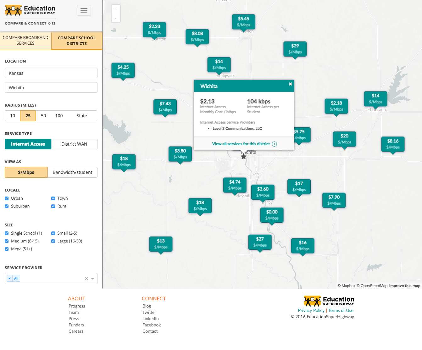 But that’s not stopping the team from pondering new methods of impact. Since unveiling a beta version of Compare & Connect K-12 in January, Marwell said EducationSuperHighway—which is funded by organizations such as the Ford Foundation, the Learning Accelerator, as well as Mark Zuckerberg and Priscilla Chan, who recently donated $20 million to the non-profit—already has ideas for where they might take the tool next. He’d like to “enhance the ability of users to take action,” whether that’s helping more districts get out RFPs or connecting them with service providers through an online messaging app.