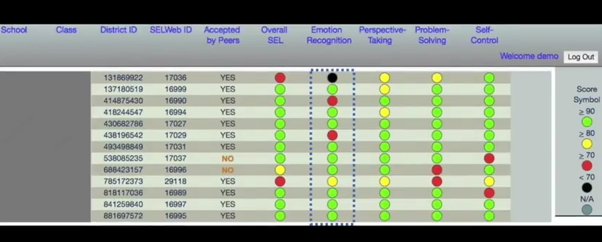After students complete the test, teachers receive a report with information about each student. The reports are similar to those generated by standardized tests. They score students across four areas: emotion recognition, perspective-taking, self-control and social problem solving--how well students cope with stressful, everyday situations. The reports also provide data on peer acceptance and social connections within the class.