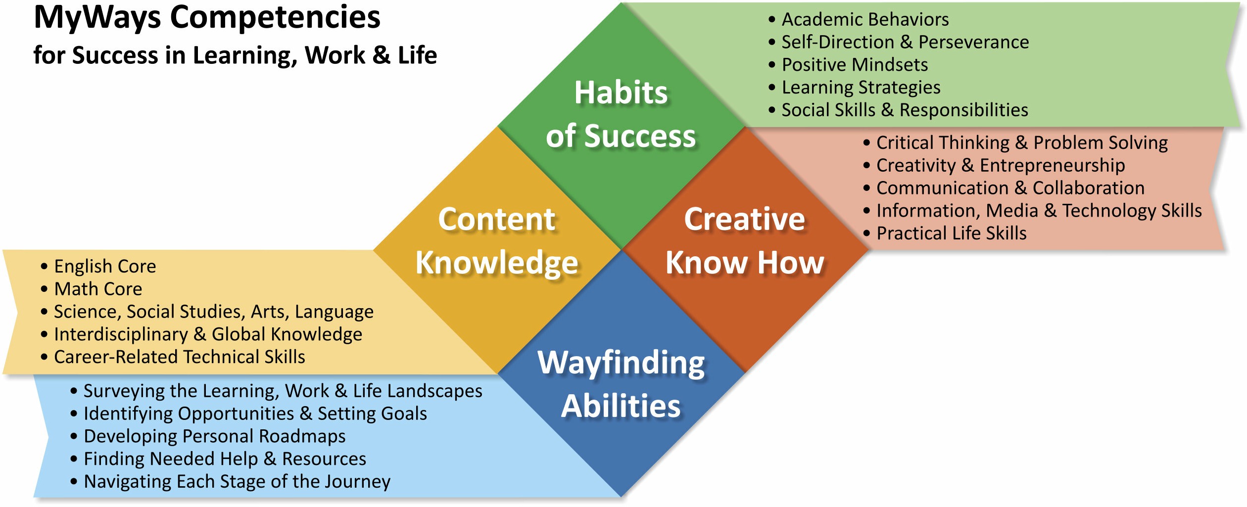 Toward the end of its first year, LAB was introduced to a draft of the MyWays Framework, developed by Next Generation Learning Challenges (NGLC), which outlines 20 competencies that students need for future success. The competencies are grouped into four quadrants: Content Knowledge, Creative Know-How, Habits of Success and Wayfinding Abilities. The framework came at the perfect time as Mote and Tucker were investigating how to incorporate essential non-academic skills that supported their shifting vision of student success.