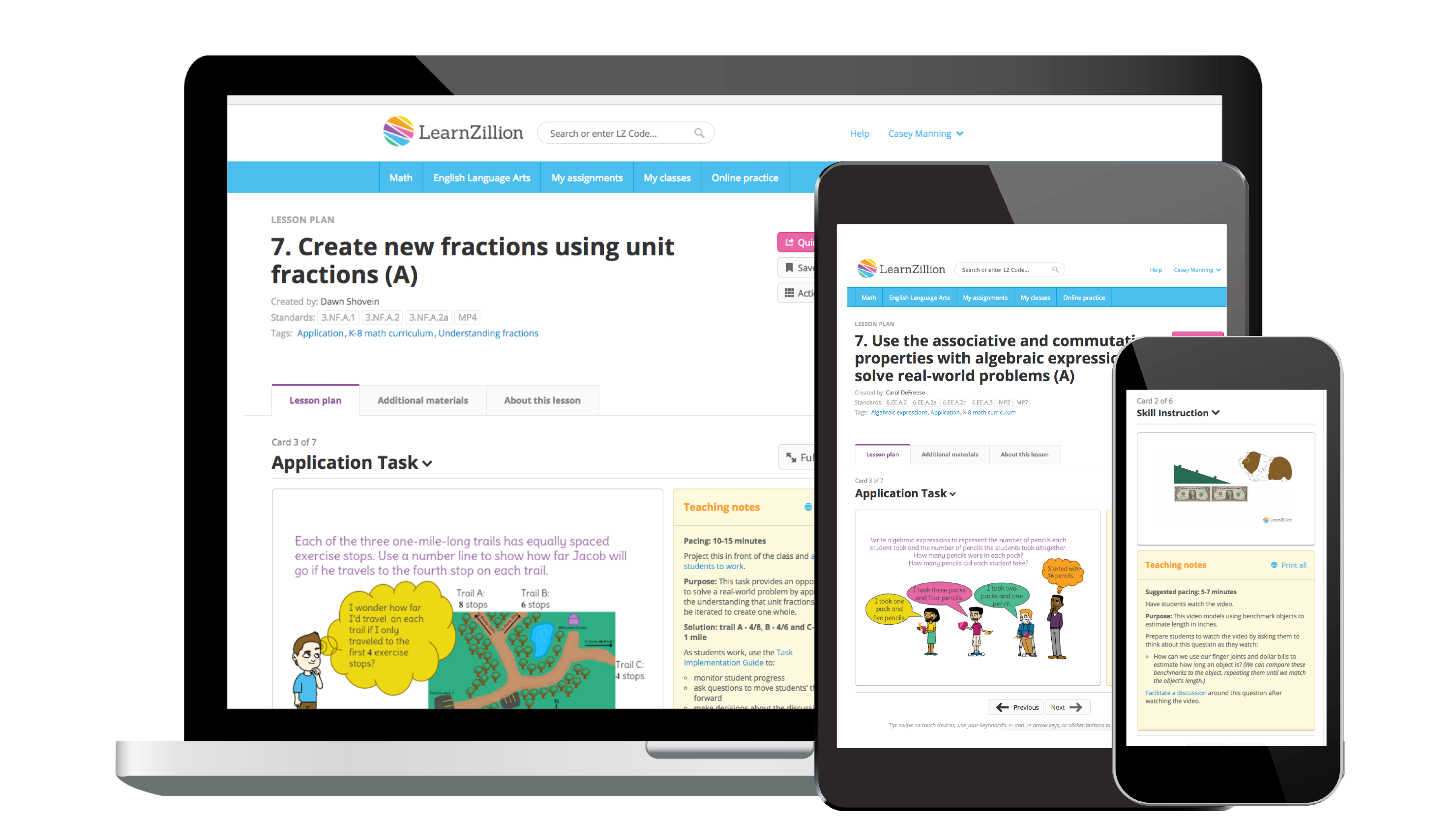 There’s a lot of flexibility. Let’s use a multiplication problem as an example. The teacher can decide to project the lesson and lead it whole-class. But she can also decide to assign the lesson to groups to work on collaboratively, or to individuals to work on independently, while she works with the rest of the class. Suddenly, setting this all up is really easy with the tools in LearnZillion. But with a static curriculum model, the amount of work a teacher would have to put in to try and do any of those things—it’s just not feasible that a teacher could do that day in and day out.