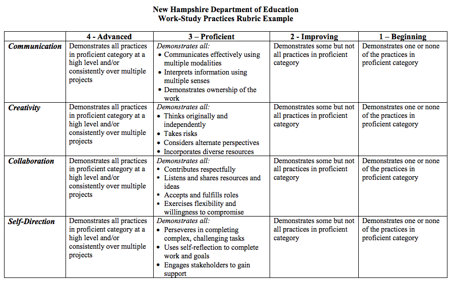 During this time, the NHDOE determined that in order for a competency-based model to be successful, students needed to develop a set of behaviors related to work ethic, such as time-management and responsibility. They dubbed the behaviors “Work-Study Practices” (WSP). In 2014, educators and administrators, including two representatives from Sanborn, convened to define the WSP and outline how each would be demonstrated by a graduating senior in high school. The group settled on four practices: communication, creativity, collaboration and self-direction.