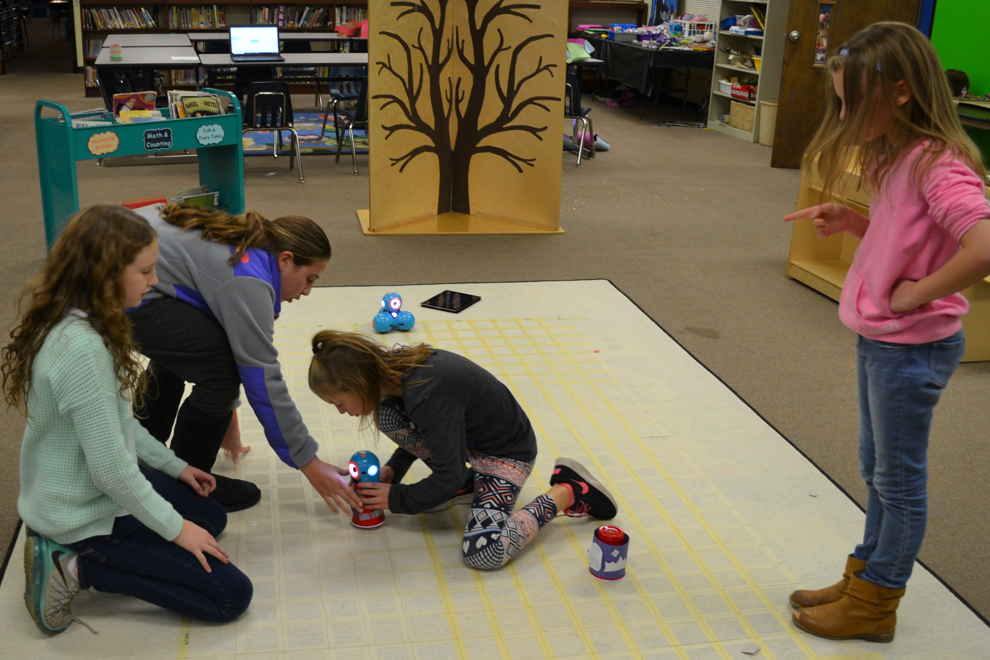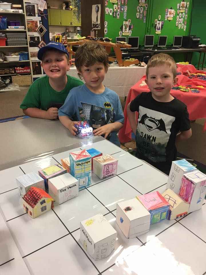 Recently we have added a set of BeeBots. These are designed for use by young children. This colorful, easy-to-operate, and friendly little robot is a perfect tool for teaching sequencing, estimation, problem-solving, and is programmed by just pushing buttons. This is the perfect introduction to the higher levels of coding they will experience as they get older. In our first project the students designed a community, built small buildings, and set them up on a gridded mat. Then students programmed the little BeeBot to travel to different buildings in their community.