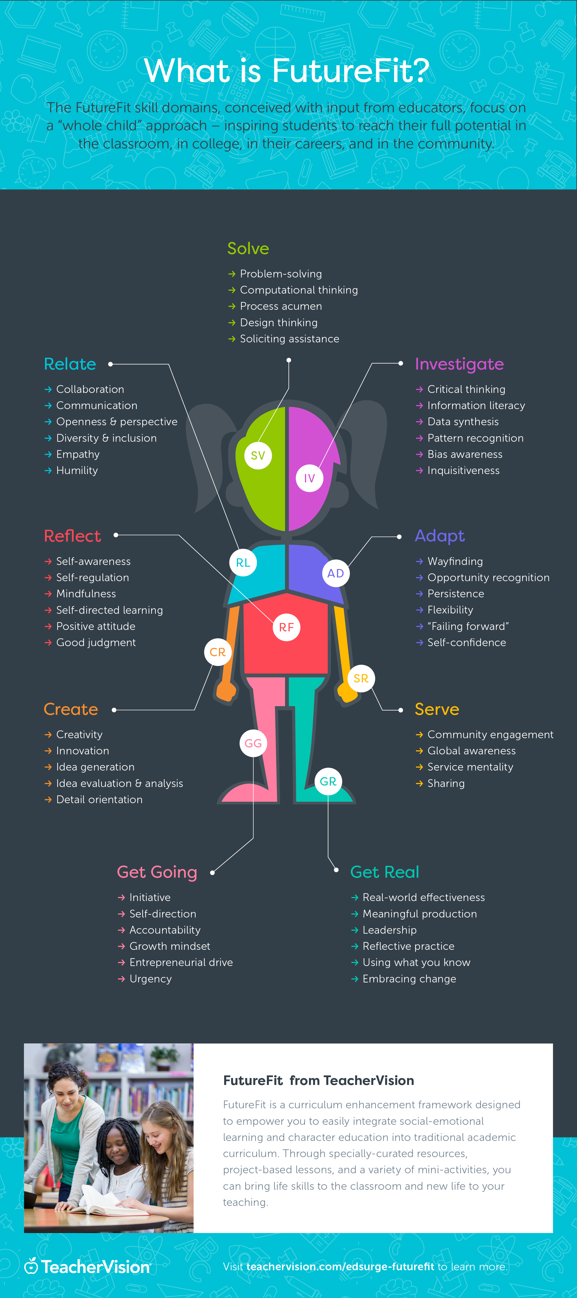 Accordingly, frameworks have been created. Standards have been developed. PD has been implemented. Books have been written. Yet at the individual classroom level, the simple ways to describe, organize and teach the skills students need to be future ready are still a little nebulous. In adapting many of our existing K-8 curricular resources to meet teachers' evolving needs, we have culled our broad and diverse collection of skills into nine domains we call FutureFit. We think these skills will help teachers develop the whole child.
