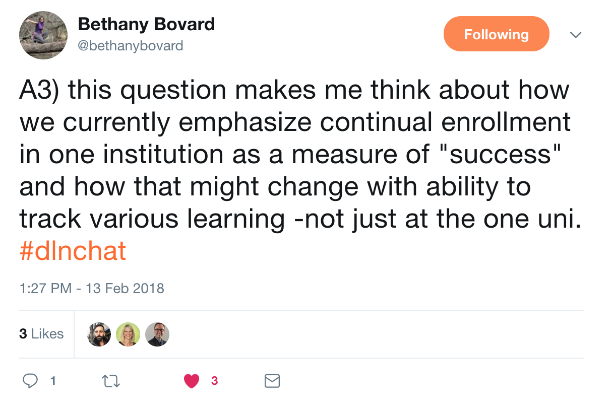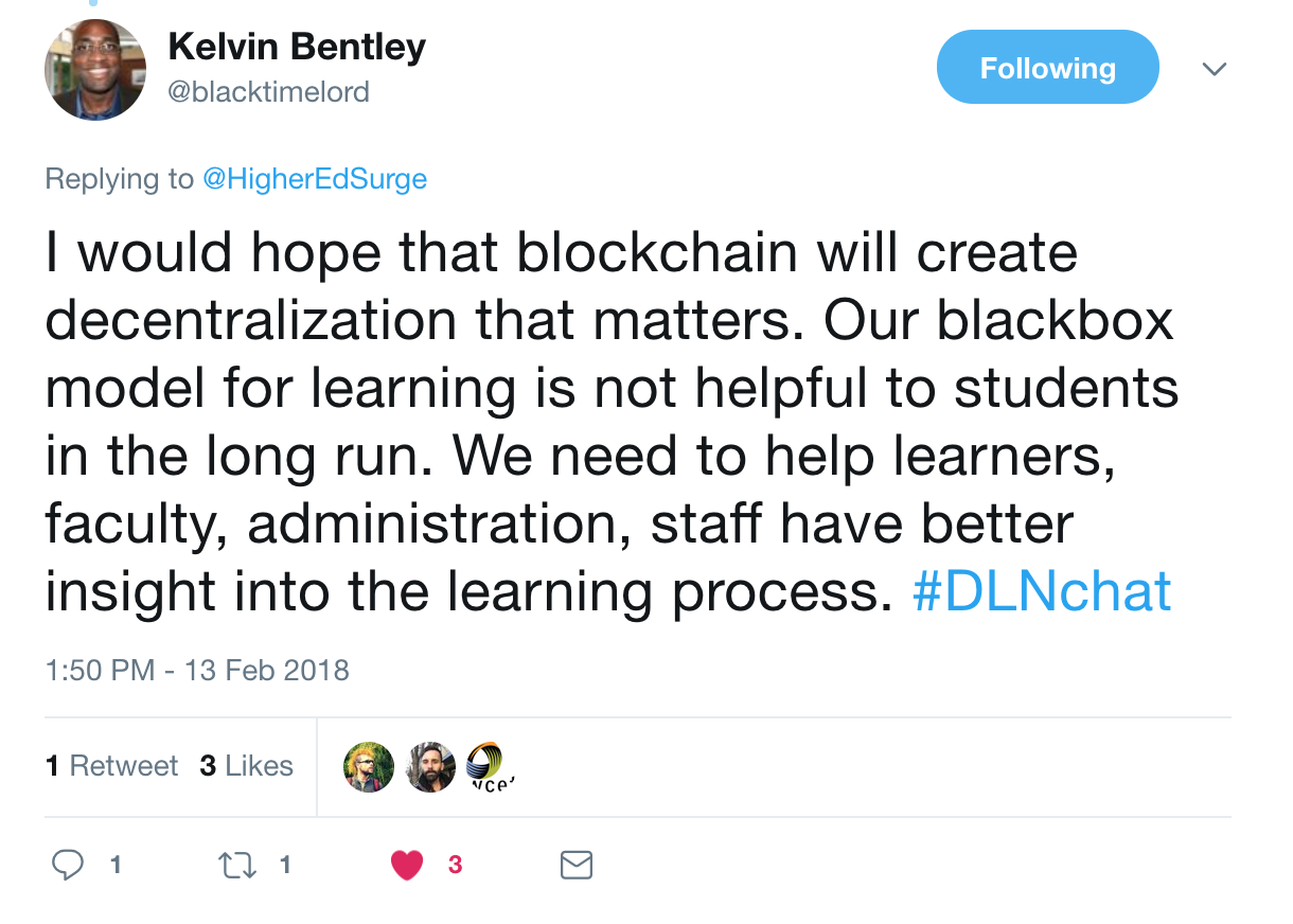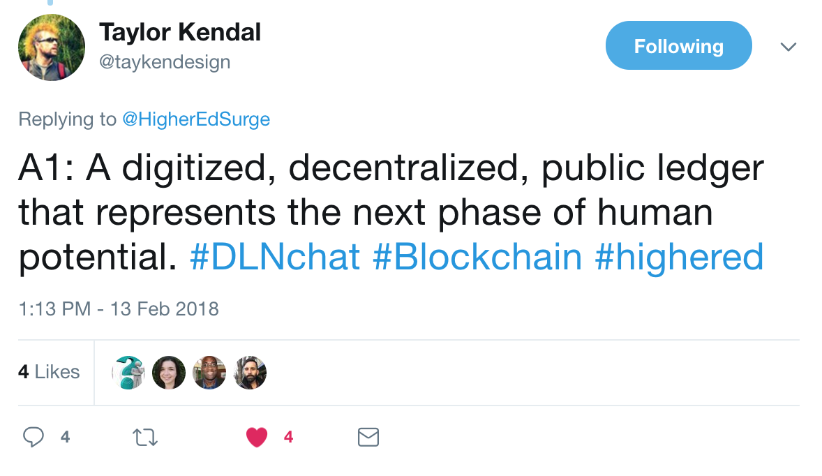 The chat started off by defining blockchain, the technology underlying cryptocurrencies such as Bitcoin and Etherium. Some kept their definitions simple, such as “a distributed database,” from Trish Briere. Others were a bit more whimsical. Bryan Fendley called blockchain “something we can’t ignore,” and Paul Wilson, a “daisy chain digitalized.” Taylor Kendal brought in the technology’s grand possibilities: “A digitized, decentralized, public ledger that represents the next phase of human potential.” Other guests shared resources to provide more thorough definitions of the technology. For folks who need an introduction to blockchain we recommend starting with the video in this EdSurge article from our blockchain meetup in Berkeley. For those who want to continue down the rabbit hole, check out this comprehensive list Bethany Bovard put together for #DLNchat.
