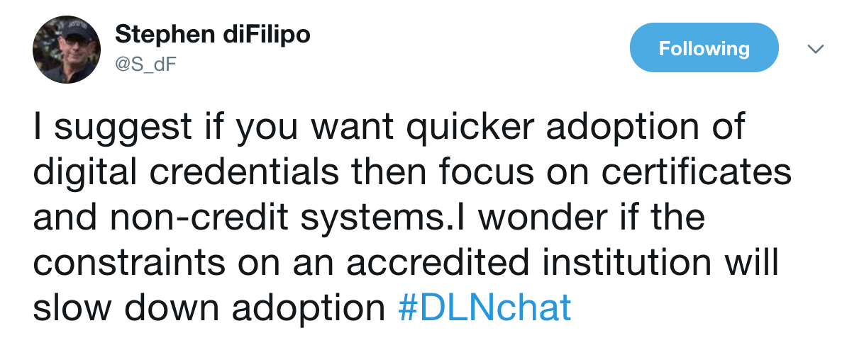 Matt Meador and many others were excited by this idea of decentralizing the traditional owners of learning validation, that being higher education institutions themselves. But special guest Stephen diFilipo recommended, “If you want quicker adoption of digital credentials then focus on certificates and non-credit systems.” He also added, “I wonder if the constraints on an accredited institution will slow down adoption.” Clay Forsberg furthered the thought: “Simply by acknowledging these "outlying" types of learning vehicles - we give them credibility. And once they acquire credibility - they proliferate ... hopefully resulting in a more learned society.”