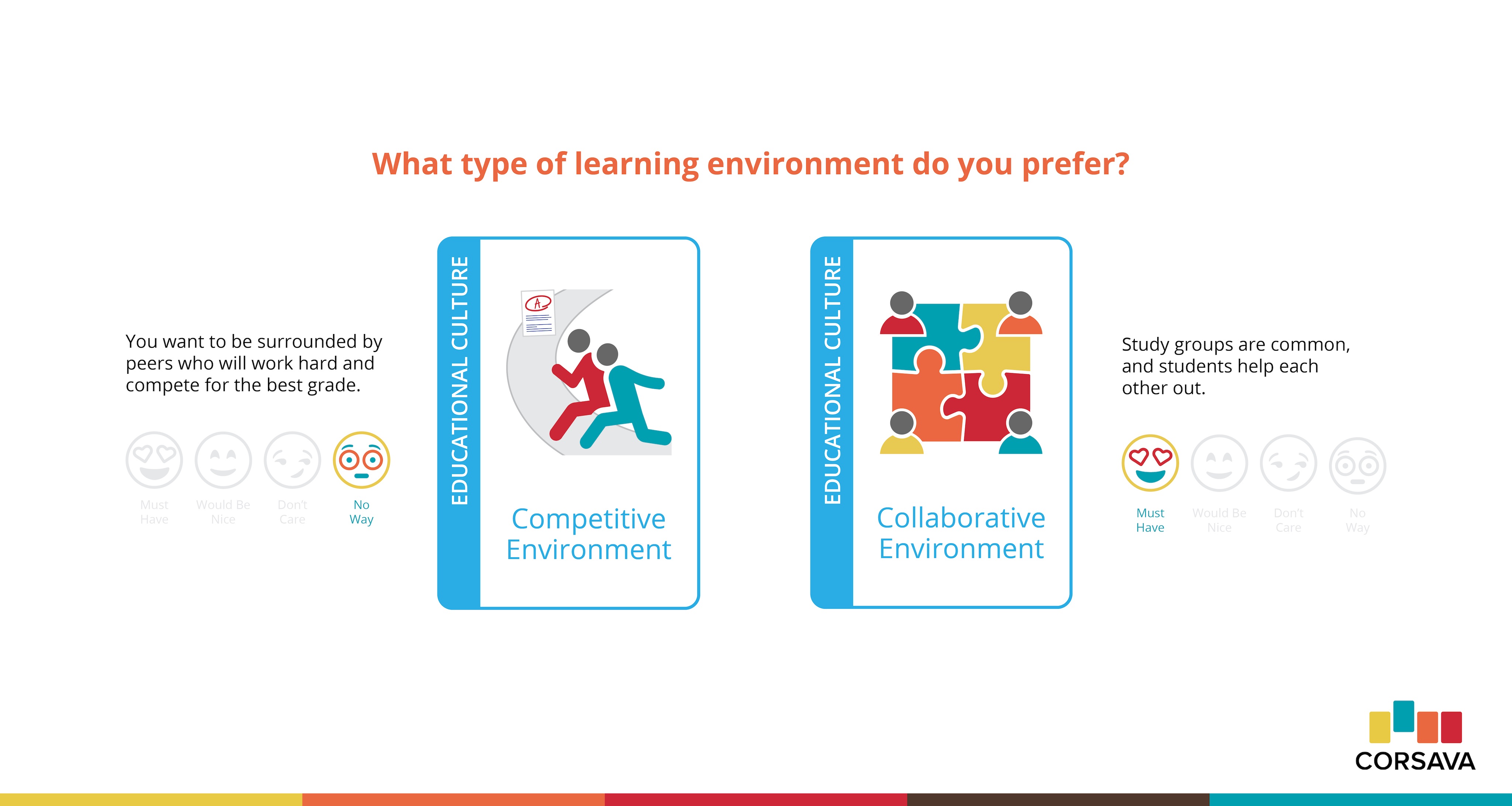 Students explore their preferences for campus and educational culture, residential life, student resources, academics and extracurricular life.