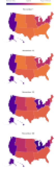 The shift between Nov. 15 and Nov. 22 is also visible regionally, when a single attendance structure score is calculated for all the districts in a single region on each date. (See regional maps below.) The Great Lakes and the Rocky Mountain regions showed the greatest movement toward only offering remote instruction in that week.