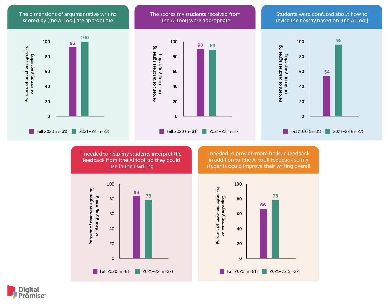 During three implementation waves (winter 2020, fall 2020 and school year 2021-22), almost all teachers using Project Topeka agreed that the dimensions the AI tool scored were appropriate and agreed with the scores their students’ writing received. However, a majority also told us that students were confused about how to respond to the feedback. The teachers needed to help students interpret and apply the feedback and provide more holistic feedback. (See Exhibit 1.)