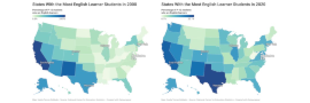The Midwest and Pacific Northwest have more English learners than they did 20 years ago, too. While perhaps growing at more modest rates, all but nine U.S. states experienced an increase in English learner students over that time period.