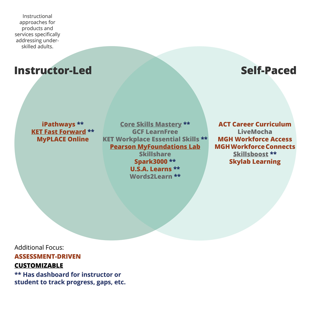 Pearson MyFoundations Lab Competency-based courseware with an emphasis on personalized learning paths. Focus: Literacy, Math, Career Skills, Digital Literacy |