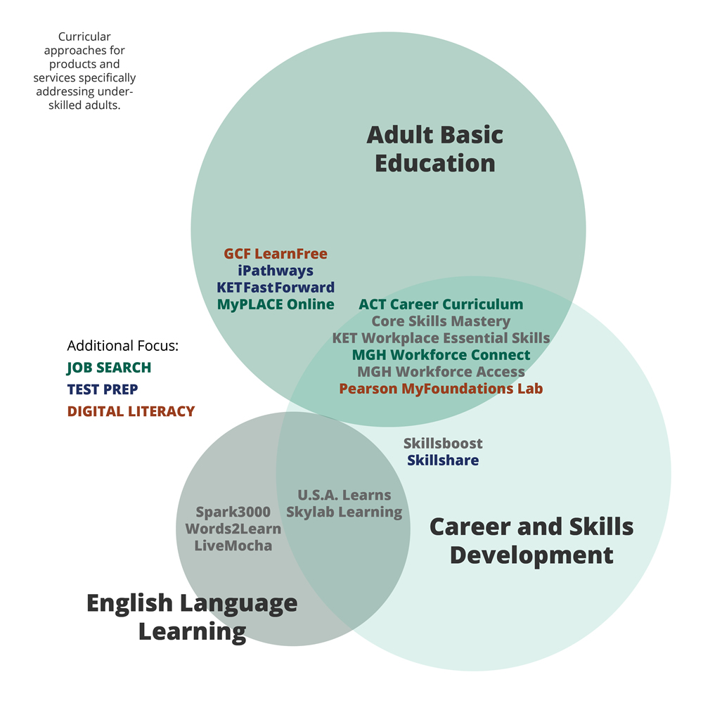 Below is a comprehensive list of products and services that specifically target under-skilled adults looking to build basic literacy, numeracy and career skills. The list is by no means exhaustive, as there are other tools which don't expressly cater to this population but offer suitable content (e.g. YouTube, Udemy).