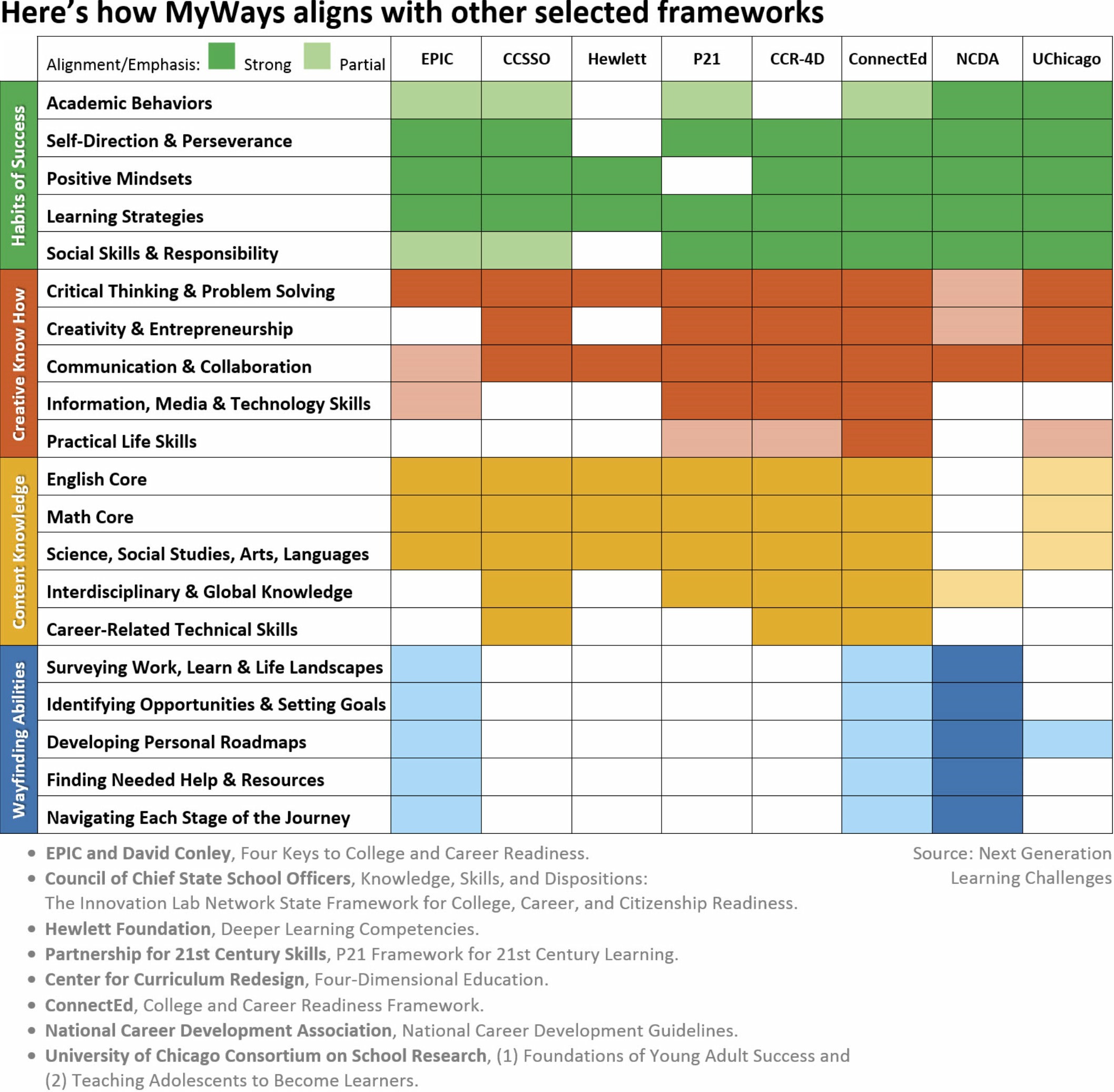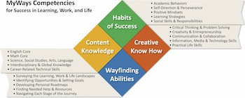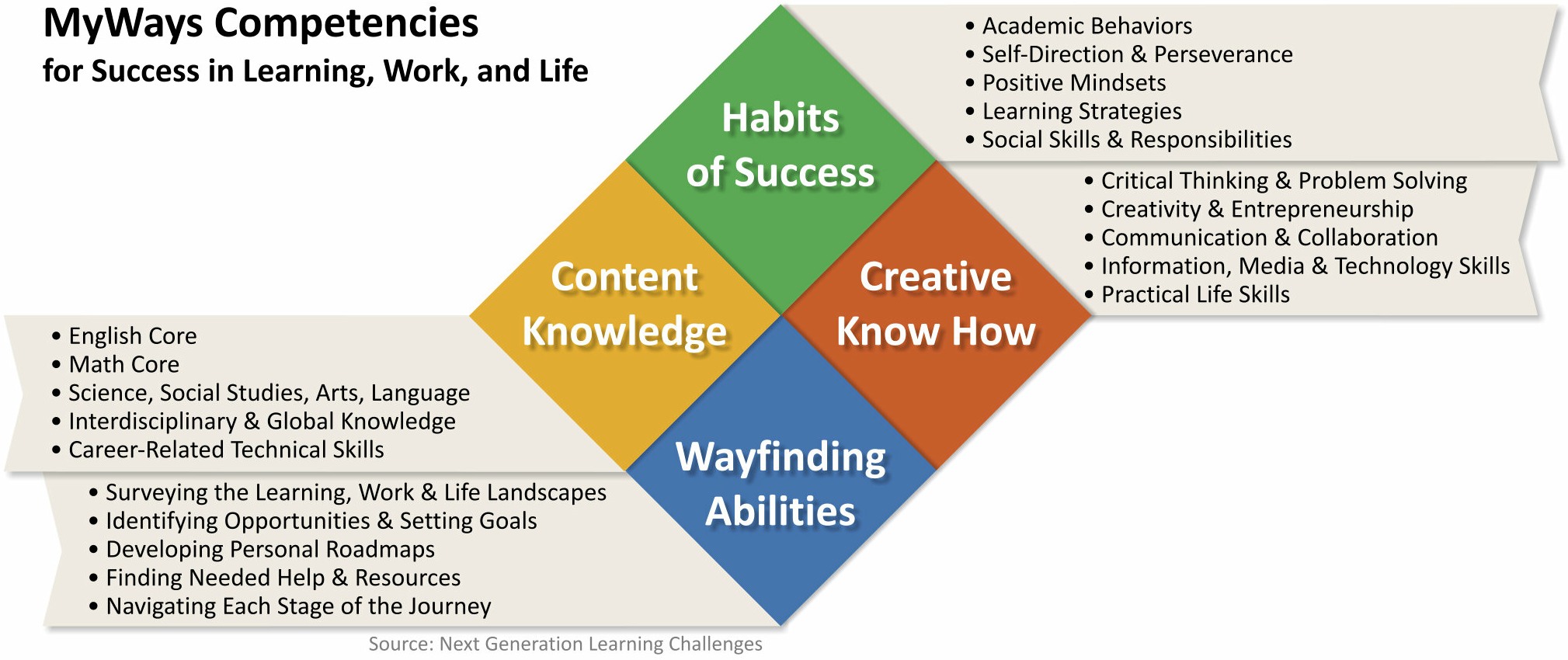 The MyWays project developed by Next Generation Learning Challenges (NGLC) provides a student success framework that is inspired by more than 25 major frameworks and dozens of other resources. It is designed to help school communities build a common language to use as they discuss the competencies that today’s learners need to thrive after high school. The project further seeks to help school leaders redesign learning and assessment models to align with their new vision.