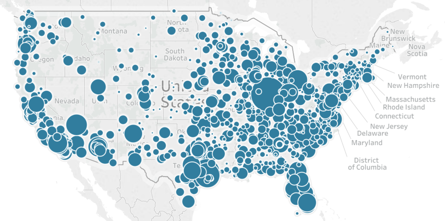 On the map below, blue circles represent community colleges where students took at least one distance learning course in 2015. The bigger the dot, the more distance learners enrolled. The largest circle on the map belongs to Ivy Tech Community College in Valparaiso, IN, with 37,791 distance learners. The smallest—barely visible on the Canadian border—is Rainy River Community College in International Falls, MN with nine distance students. The Houston, TX area's neighboring Houston Community College and Lone Star College System together boast more than 40,000 students. And a whopping 20 Los Angeles County, CA community colleges account for a combined 66,000-plus distance learners.