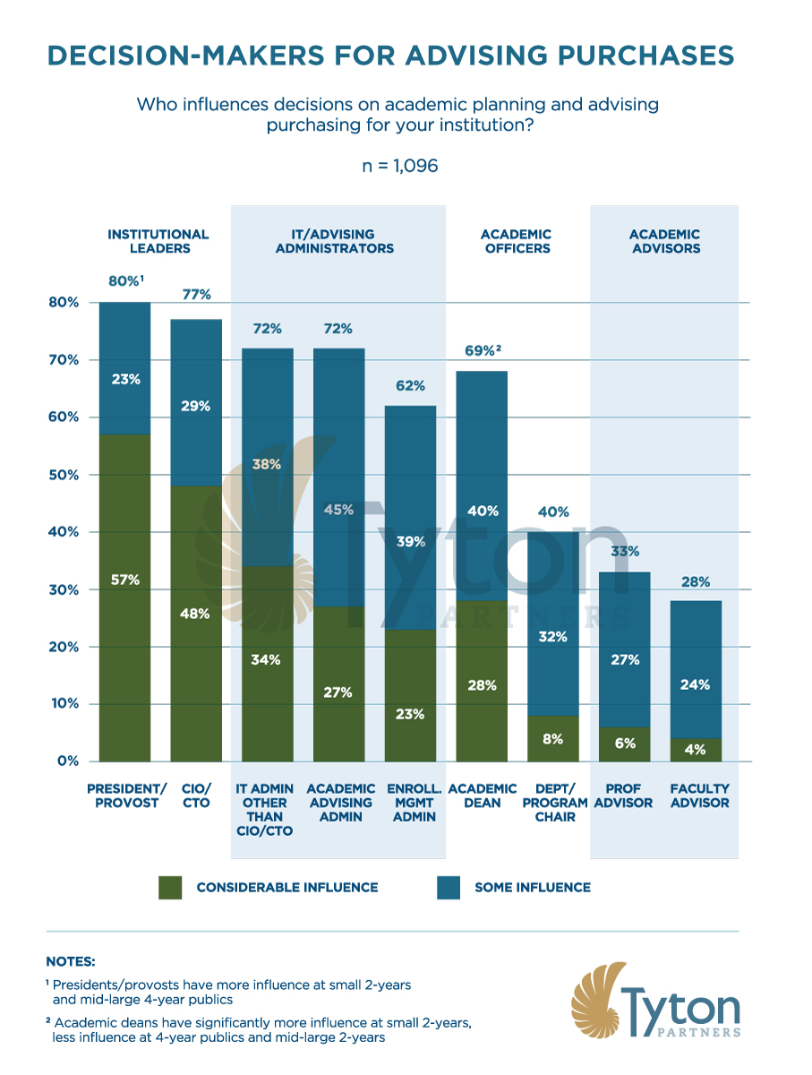 When it comes to choosing tools and programs targeting student success, institutional leaders have a strong say when it comes to purchasing decisions, according to a report by Tyton Partners. Meanwhile academic and faculty advisors, who work directly with the tools and implement change initiatives, have relatively little influence in the products their leaders select for their institutions and departments.