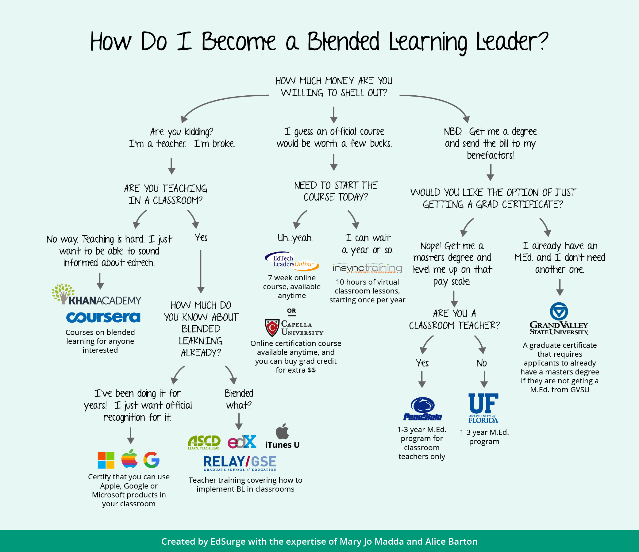 If you’re looking for solid knowledge and skills, but don’t need a degree or a sliver of virtual paper with your name on it, the options are plentiful; a number of organizations offer online courses and modules that teach the in’s and out’s of blended learning. And if none of the courses below tickle your fancy, check out EdSurge’s collection of online professional development courses. (Or, perhaps it’s just easier to build your own blended learning course?)