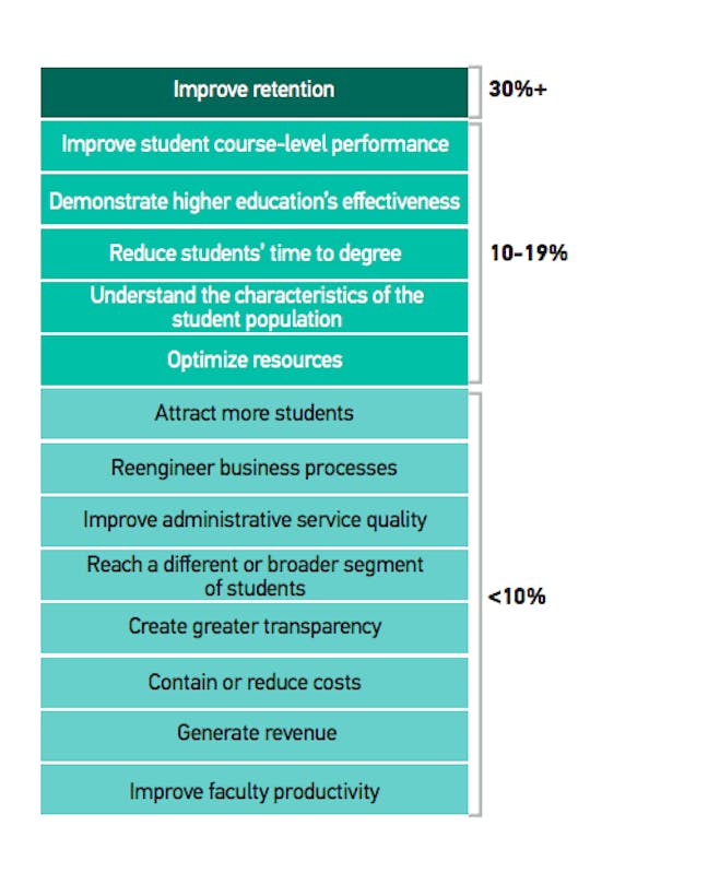 The following chart illustrates higher education institutions' motivations for investing in learning analytics, based on a 2015 EDUCAUSE member survey. Among the top five reasons listed below, three relate to student success.