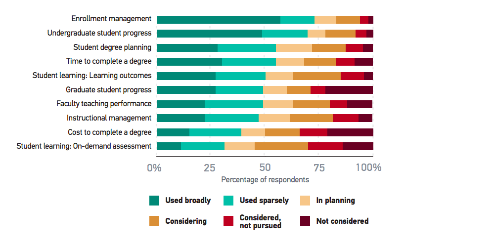 Institutions are using analytics to assist in various areas related to student success, and many are planning or considering expanding implementation in the future.