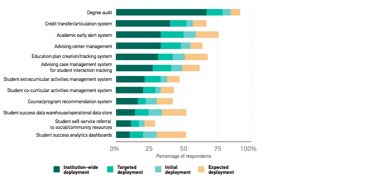 Although the implementation of multiple student success technologies is not yet widespread, their use is growing.
