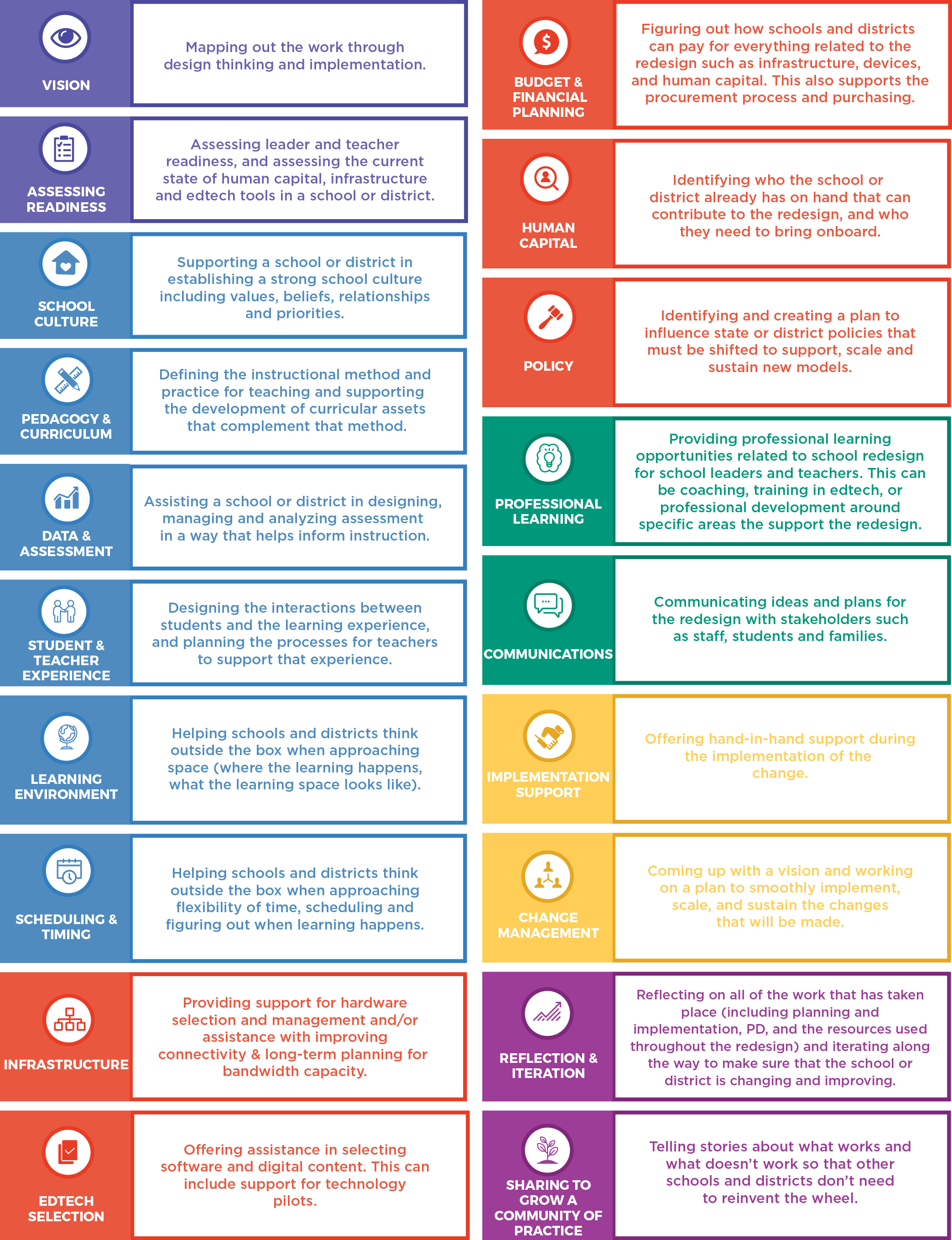 We have developed a framework to help categorize service providers that are helping schools and districts redesign their models. The framework includes a set of essential questions that educators and administrators are asking as they go through the process of redesign, as well as a collection of elements, or building blocks, that schools and districts are commonly looking to transform. Here is our framework and a guide to how we define each of the elements that make up a school's model.